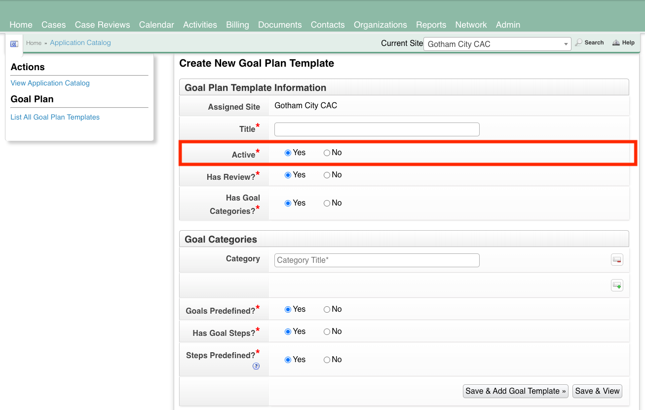 The Active field defaults to ‘Yes’, and determines whether or not the Goal Plan will be Active and usable.