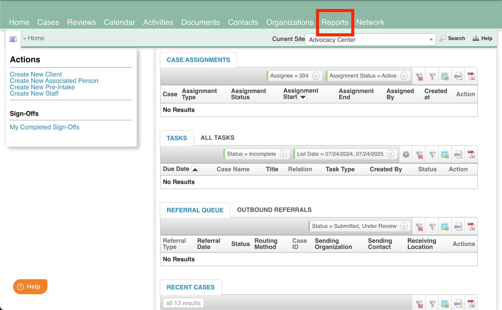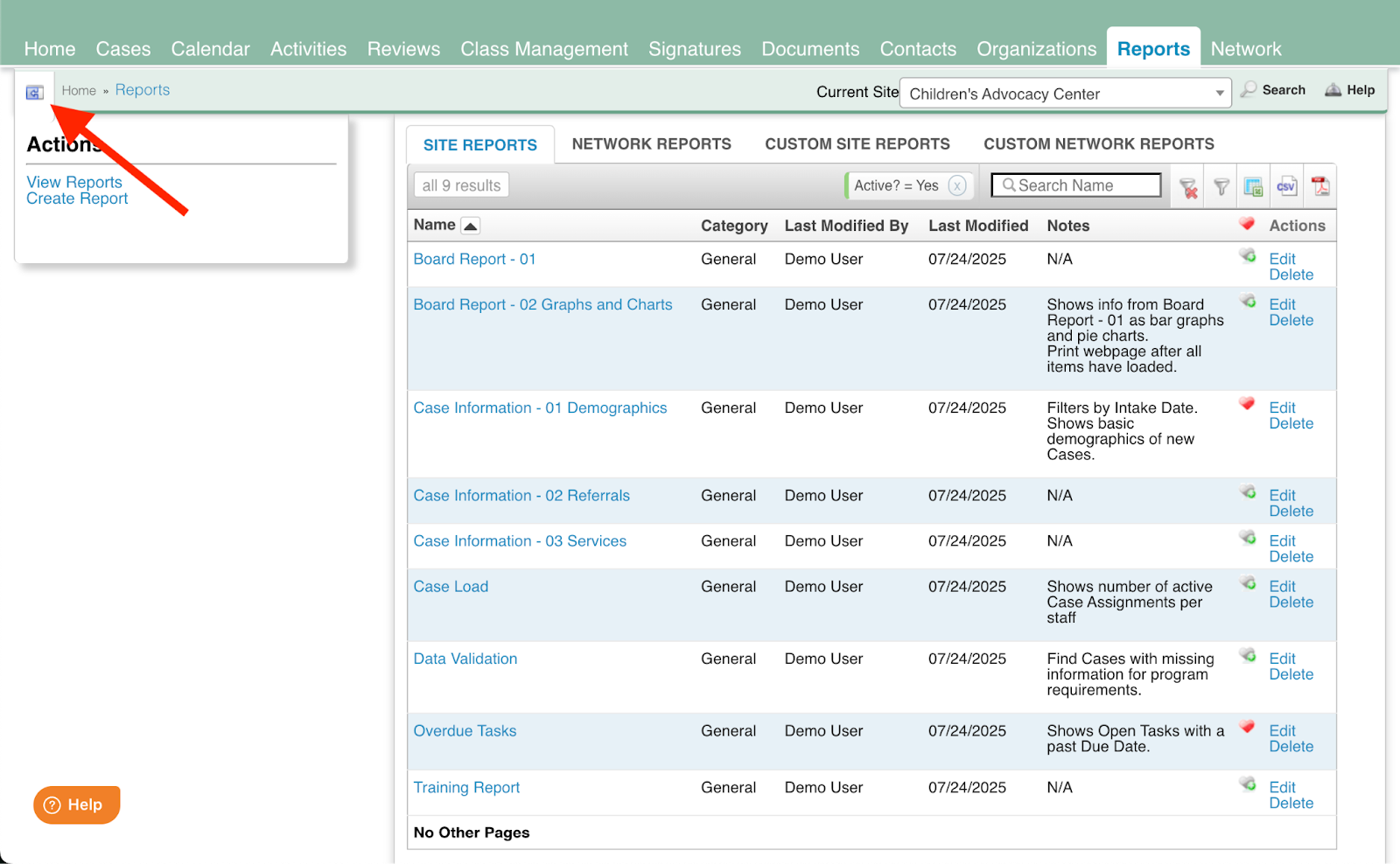 To run reports in Collaborate, click on the Reports tab. If you do not see a Reports tab, it means that your User Role does not have permission to view Reports. Ask your site administrator for assistance with your User Role.