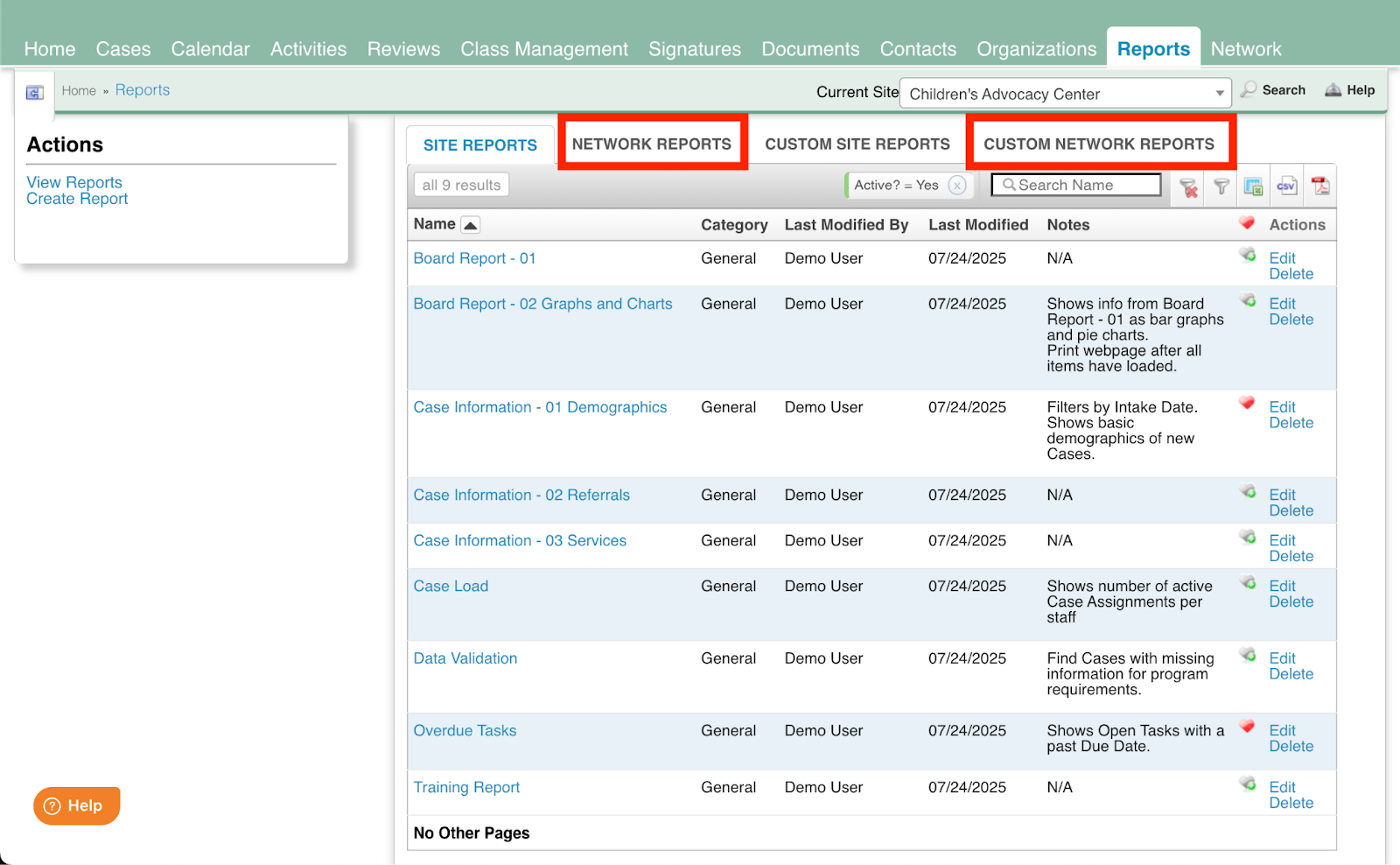 Network Reports and Custom Network Reports are a shared resource for every site within a Network. Even though the report is usable by every Site, Users will only be able to view results from the Sites that they are assigned to.