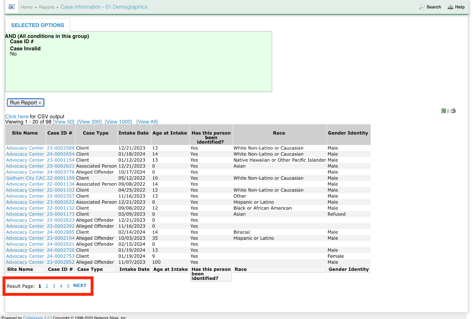 The Tabular Output splits the results into multiple pages. By default, the report will show a maximum of 20 rows. In general, showing fewer results per page will result in faster report load times. The report indicates which results are currently displayed in the Tabular Output, and it notes the total number of rows. Users have the ability to change the default number of rows displayed by clicking the links [View 50], [View 200], etc.