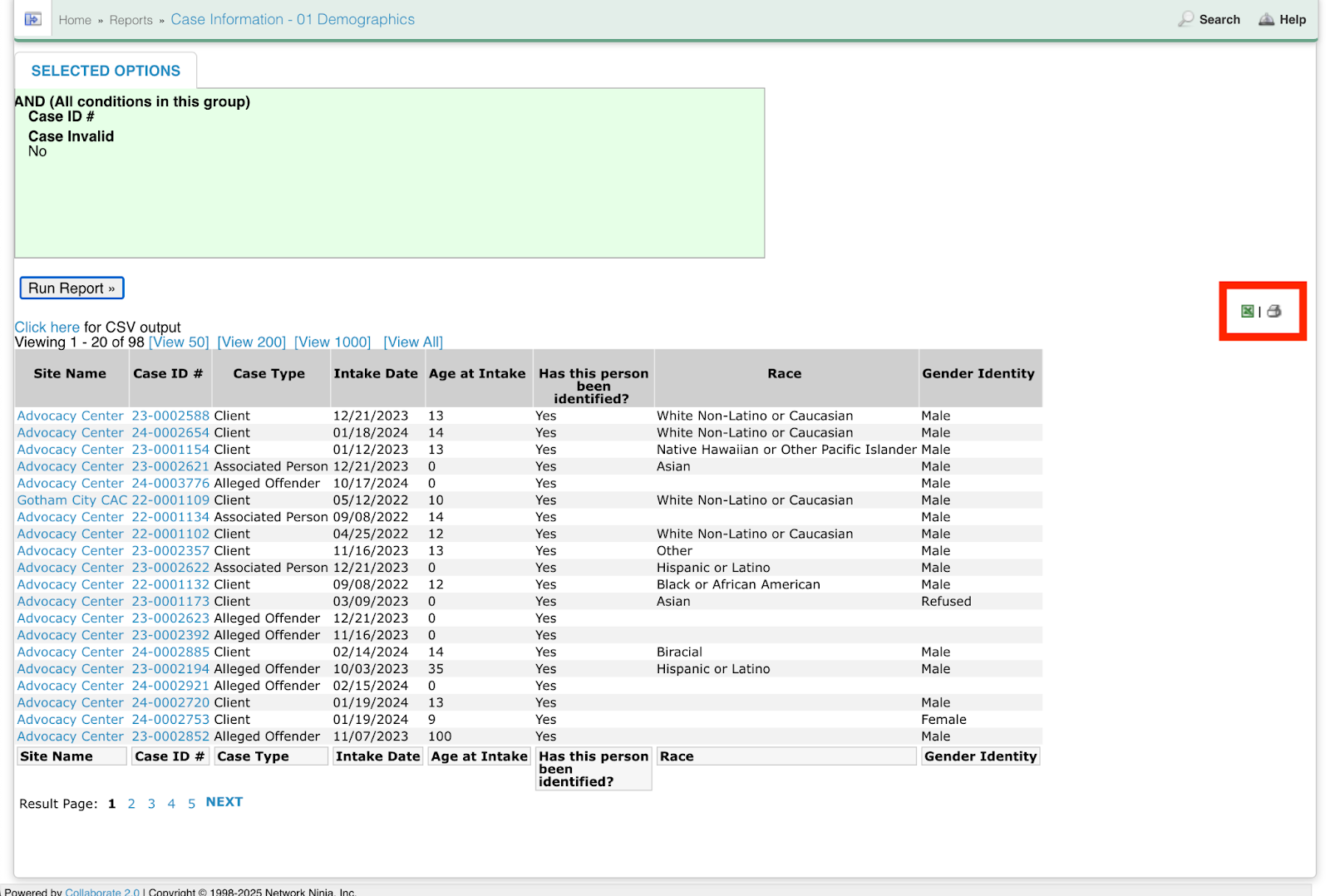 Collaborate allows reports to be exported to Excel, print-outs, PDF, and CSV. The Excel and printout options always exist, and can be found on the right-side of the page above the Tabular Output.