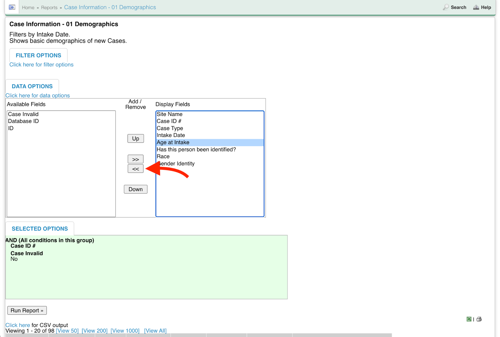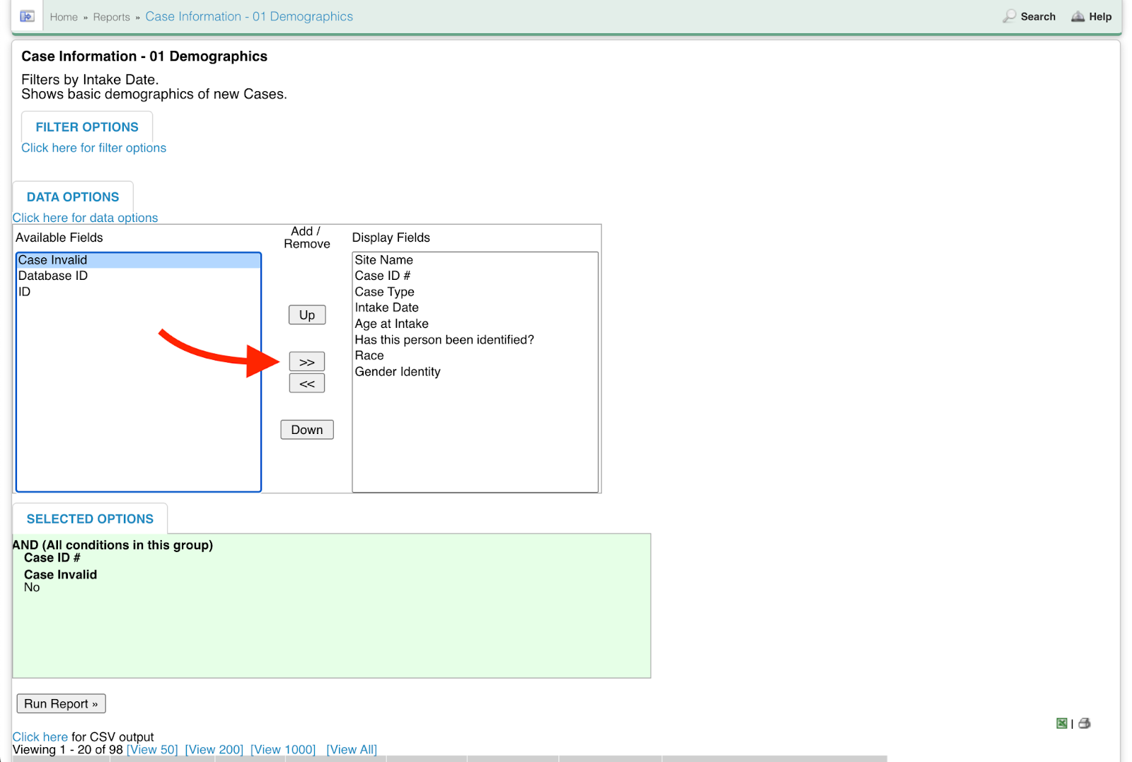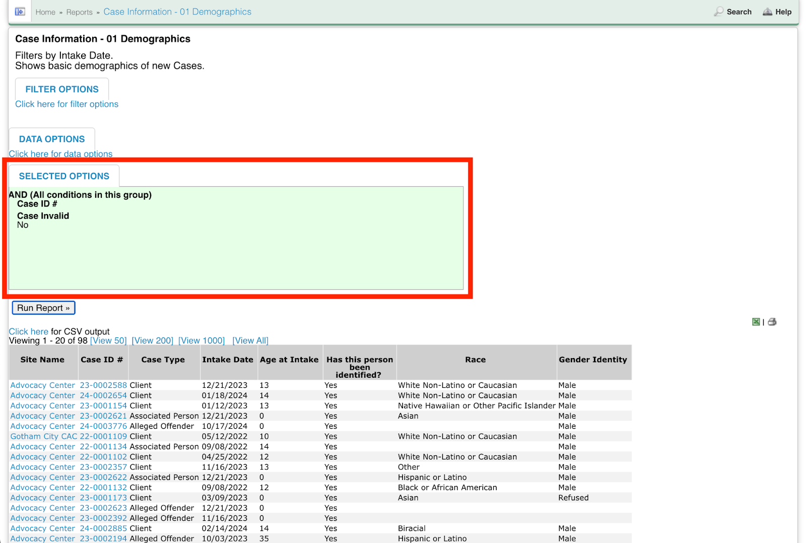 Selected options show the criteria/parameters/filters that are currently being applied to the report that the User is running. Some, but not all, of the Selected Options can be modified in the Filter Options section above.