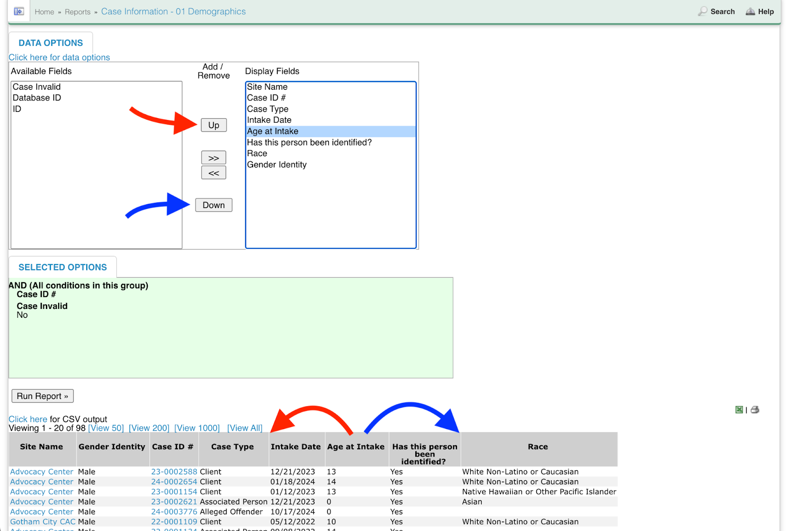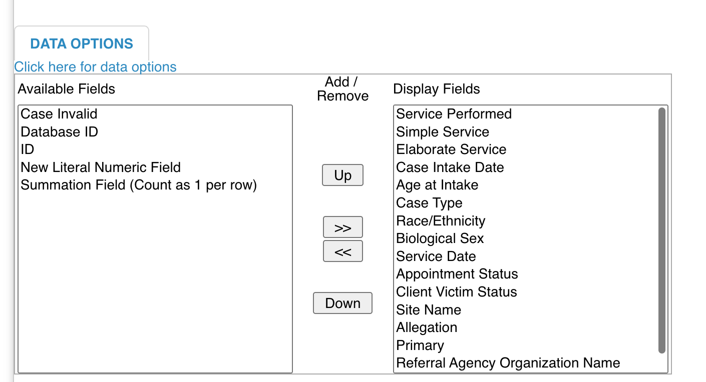 Users can change the ordering of columns by clicking the “Up” and “Down” buttons. Clicking “Up” will move the selected Display Field one position to the left. Clicking “Down” will move the selected Display Field on position to the right.