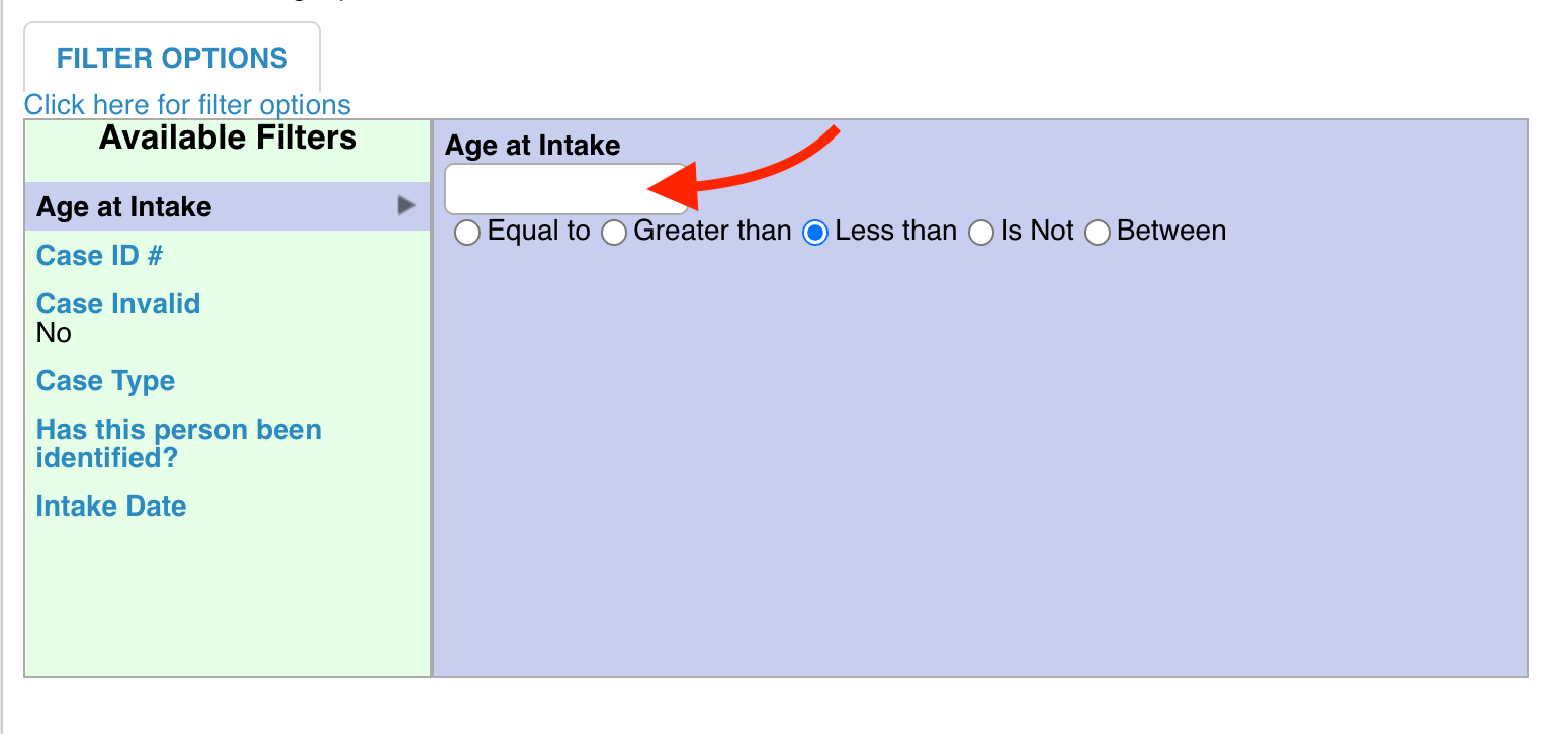 Because Age at Intake is a number field, the filter presents options about the number comparison you would like to use.