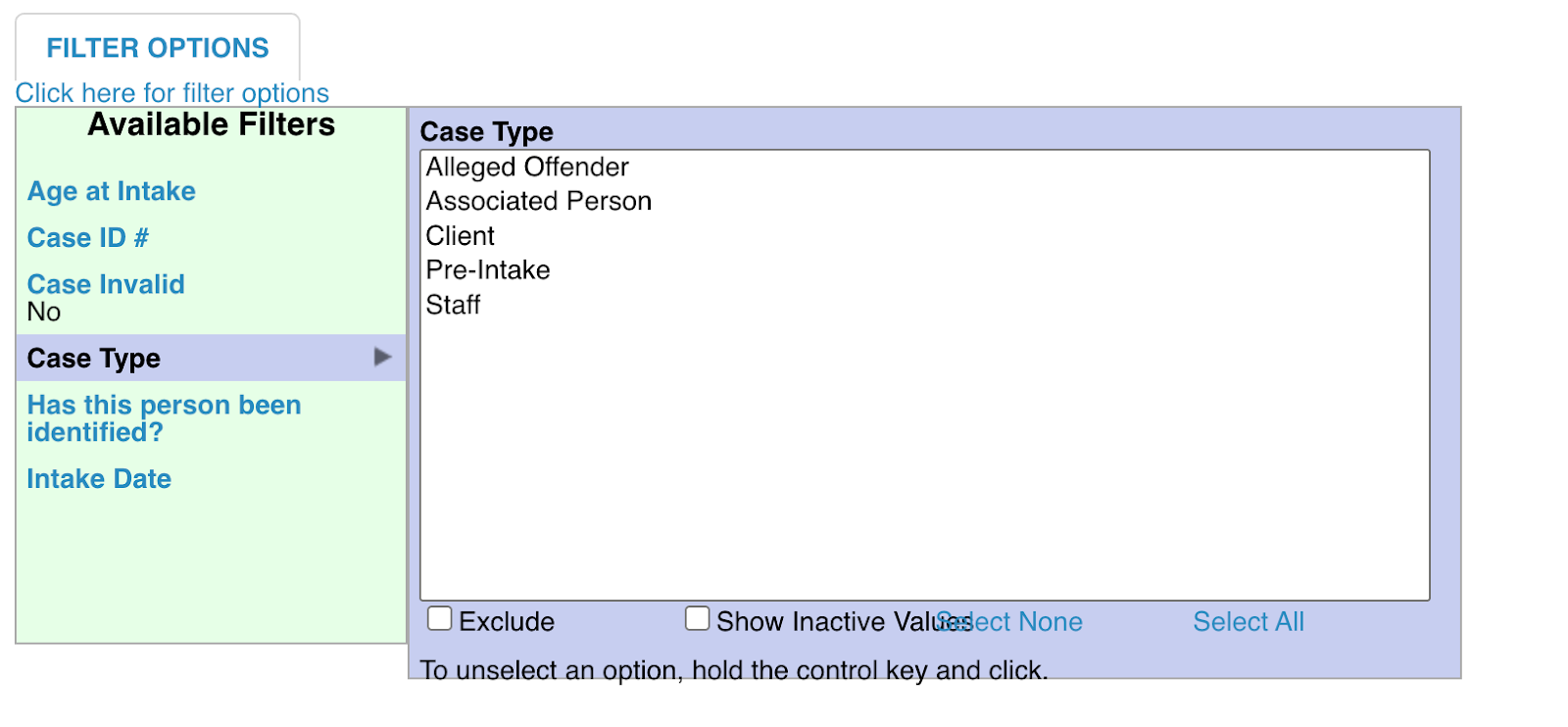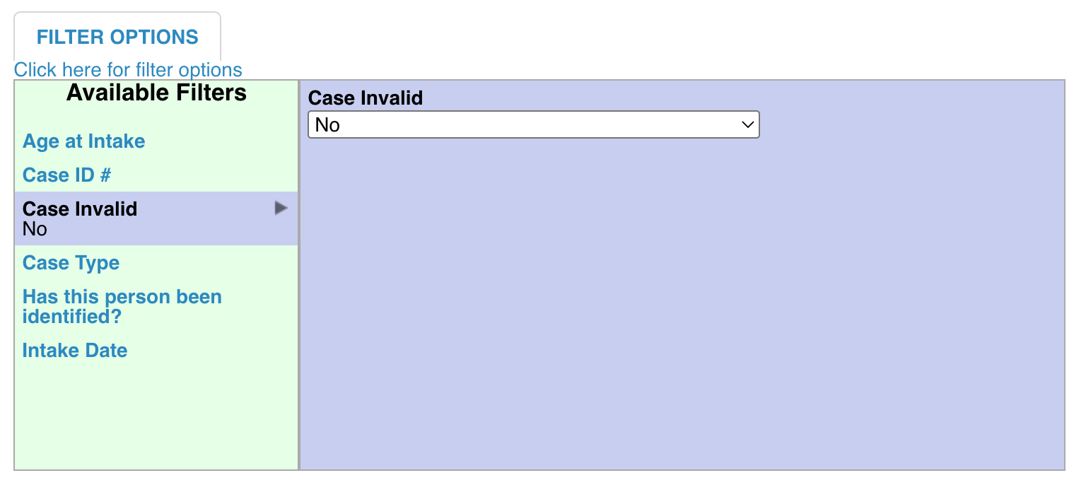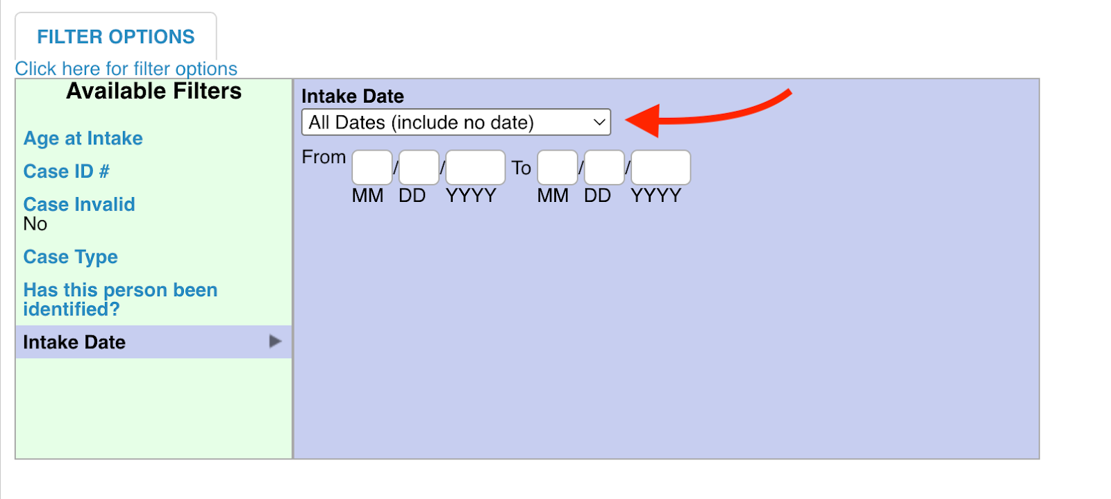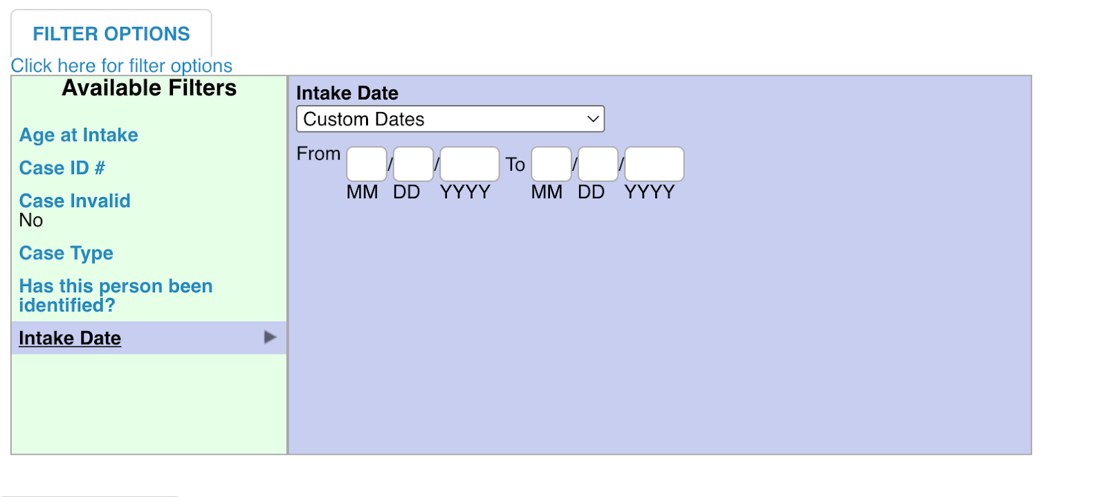An example of a Date filter is the “Intake Date” field. The Intake Date tracks the day when the Case was received by the agency.