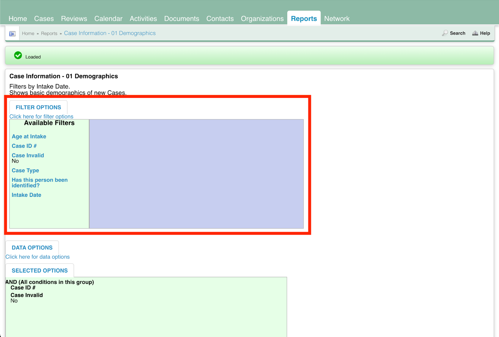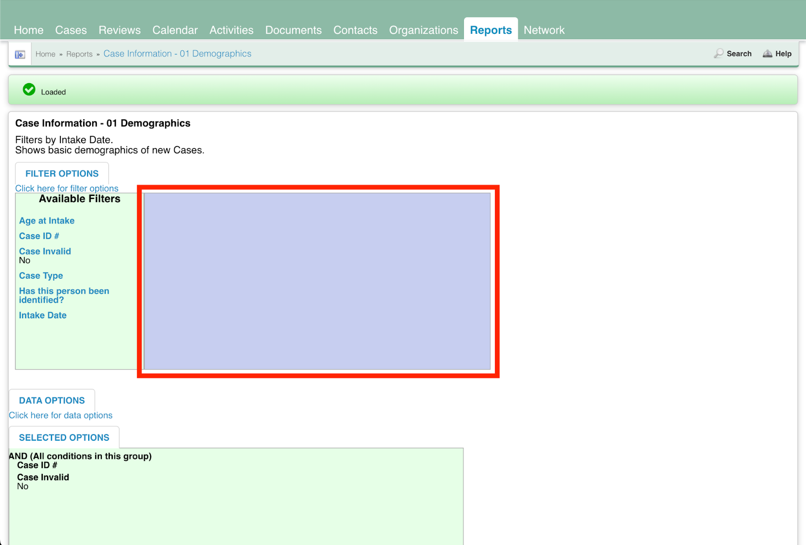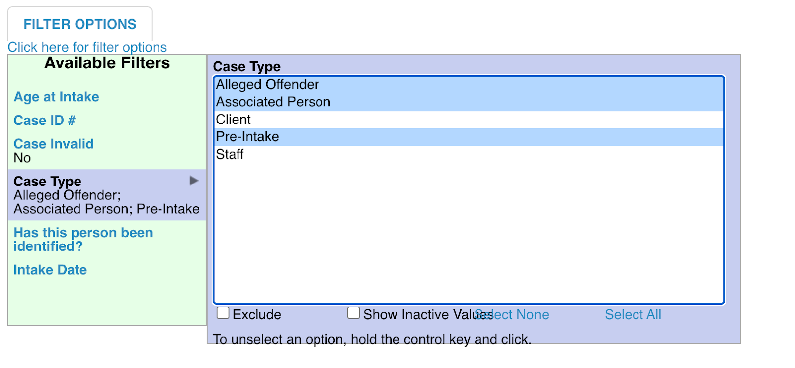 An example of a Date filter is the “Intake Date” field. The Intake Date tracks the day when the Case was received by the agency.