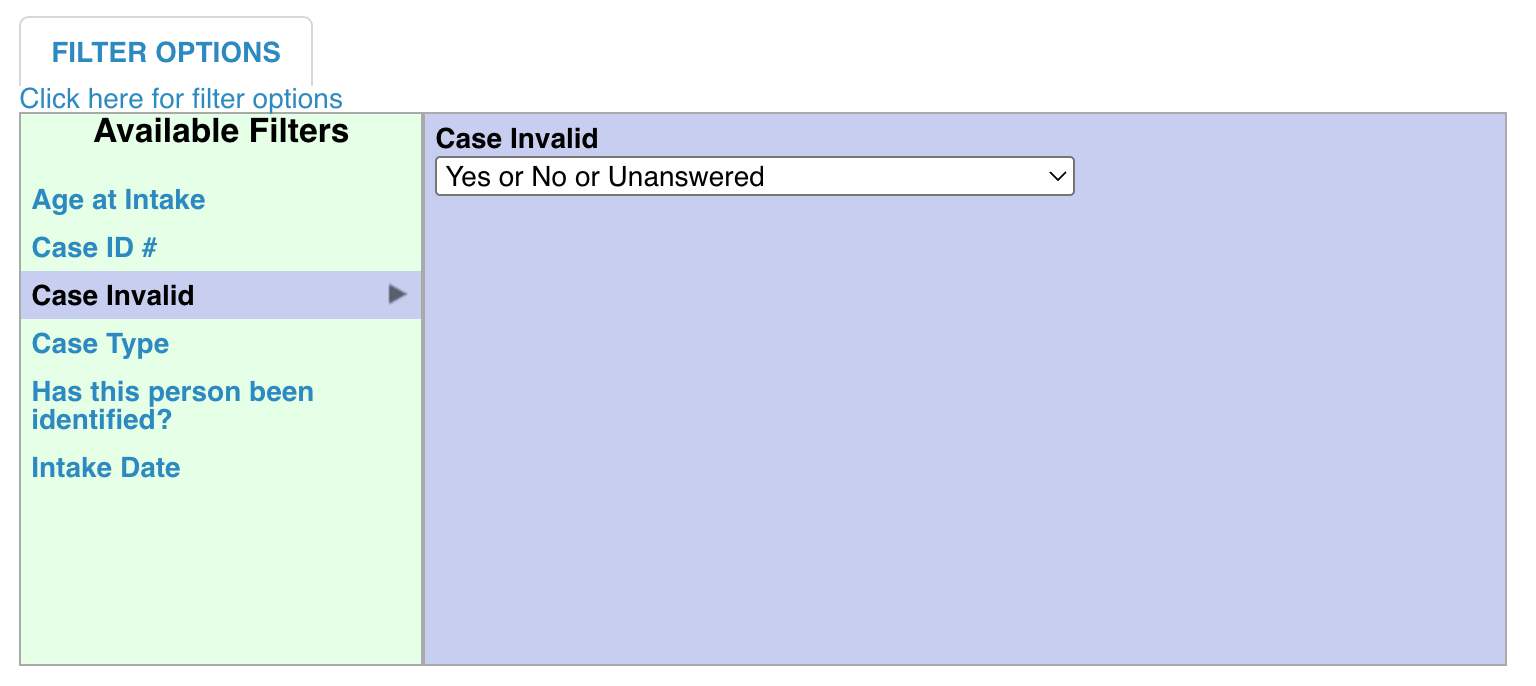 An example of a Yes/No filter is the “Case Invalid” field. The “Case Invalid” field tracks whether a Case has been marked as “invalid” as “Yes.” If a Case is “valid”, then this field will be “No”.